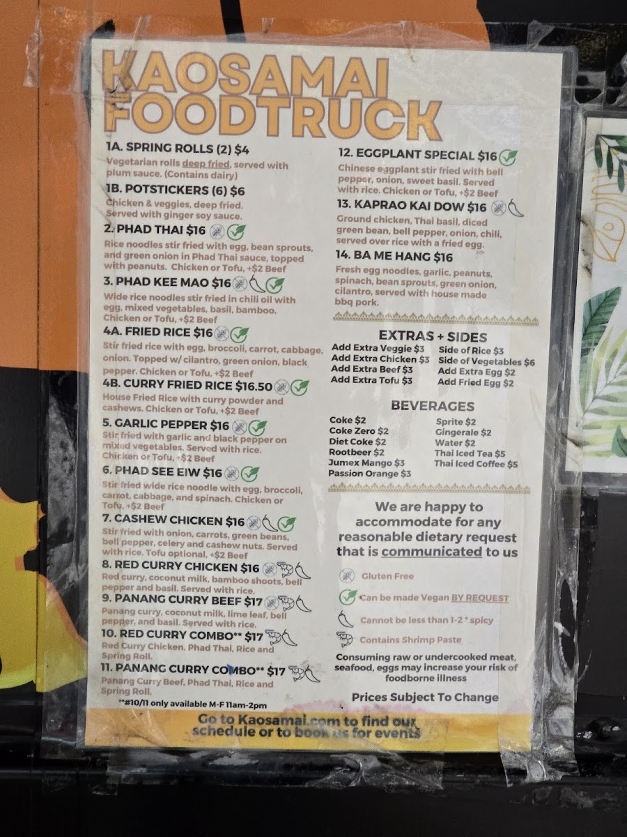 From a reviewer’s perspective, the menu at Kaosamai Thai Food Truck brings together a handful of classic Thai drinks and hearty street‑food mains that are both simple and satisfying. On the drinks side, the lineup includes refreshing options like Jumex Mango, Passion Orange, Ginger Ale, as well as traditional Thai Iced Coffee and Thai Iced Tea that pair well with spice‑forward dishes (prices typically around the low single digits to mid‑$5 range). For food, the menu highlights beloved Thai staples, such as 14. Ba Me Hang, the flavorful noodle dish 3. Phad Kee Mao (often around $15.00), and savory fried rice options like 4B. Curry Fried Rice (about $15.50) alongside classics like 1B. Chicken Potstickers and the red‑curry‑rich 10. Red Curry Chicken Combo (roughly $17.00). These offerings mix familiar Thai favorites with approachable pricing, making the truck a solid choice for a quick, tasty lunch on the go in Seattle.